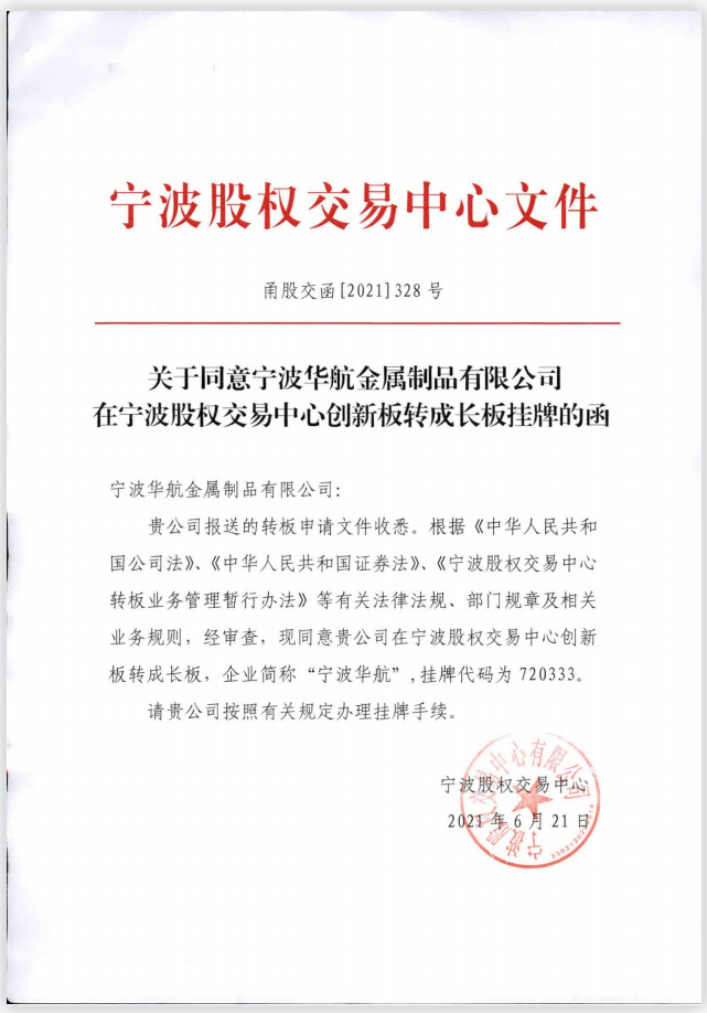 2021年6月21日,寧波華航金屬制品有限公司在寧波股權交易中心成長版順利掛牌,企業簡稱“寧波華航”,掛牌代碼為720333。